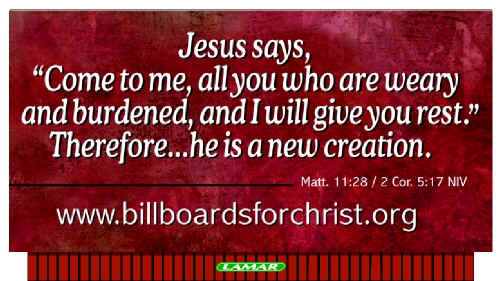 Praise be to the Lord Jesus Christ for His indescribable Gift!! Below are the copies of the Word of God posted on billboards! These billboards are posted in seven major cities in the U. S. A. 14 feet by 48 feet 12 feet by 24 feet Please tell me, what does "Come to me..." mean? Please tell me, what does "New Creation" mean? The Cities where Billboards for Christ are already posted are: Atlanta, Ga., Austin, Tx., Bridgeport Ct., Indianapolis, In., Nashville, Tn., Providence, RI. and Richmond, Va. The Cities that have asked for Billboards for Christ to be posted on them are: Chicago, Ill.; Phoenix, AZ; Waterbury, CT.; Springfield, Mass.; Columbus, OH.; Erie, PA; Orlando, Florida; Albany, NY; Syracuse, NY which has viewing for Canadian traffic; Pittsburgh, PA; Ozarks, Missouri; Slidell, La; Houston, TX. We are still not in these cities. We need your help! If you would like to sponsor one of these cities, please write our Feedback. I would like to see your list of Bumper Stickers. If you would like to be placed on our e-mailing list to receive our newsletter, please let us know on our feedback page. Bring me to What is BFC or to Costs of Billboards or Back to Billboards |