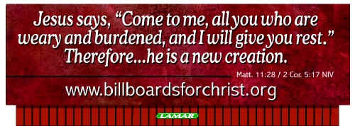 Send Donations To: Billboards for Christ, Inc. P.O. Box 27 Chester, MD, 21619-0027, U.S.A. "Everyone who calls on the Name of the Lord will be saved." "Todo aquel que invoque el nombre del Señor sera salvo." - Joel 2:32, Romans 10:13, Romanos 10:13 Fair Use Permission is granted for all teachings on this website with one constraint: All printed or verbally read material must note "Copyright of Billboards for Christ, Inc. Found at www.BillboardsforChrist.org". For more extensive use, please contact us. All Bible verses are from The Holy Bible, New International Version®, NIV®. Copyright© 1973,1978,1984 by International Bible Society®. Used by permission. All rights reserved worldwide. -- La Santa Biblia, Nueva Version Internacional®, NVI®. Copyright© 1999 by International Bible society®. Used by permission. All rights reserved worldwide. -- Verses followed by TEV or CEV are from Today's or Contemporary English Version with copyright permission of the American Bible Society.. NKJV is by Thomas Nelson Publishing. Nueva Biblia Latinoamericana de Hoy(NBLH)©2005 by The Lockman Foundation, La Habra, California All other writings are used with copyright permission of CSB. Have questions or comments about this web site? Write our webmaster at FEEDBACK Copyright © 2002 Need Hope. For Personal Faith Questions please contact us through our FEEDBACK page. Billboards for Christ, Inc. is not responsible for the content of the links on our website. See also www.NeedHope.net Have questions, comments or problems about this web site? Send e- mail through our FEEDBACK page. Copyright © 2000 Billboards for Christ, Inc. Last modified: July 20, 2001 |