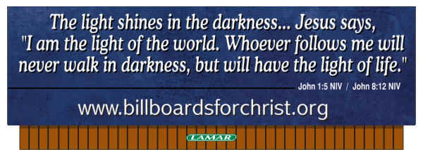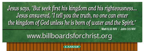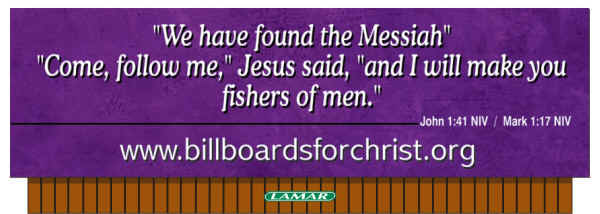 Send Donations To: Billboards for Christ, Inc. P.O. Box 27 Chester, MD, 21619-0027, U.S.A. "Everyone who calls on the Name of the Lord will be saved." "Todo aquel que invoque el nombre del Señor sera salvo." - Joel 2:32, Romans 10:13, Romanos 10:13 Fair Use Permission is granted for all teachings on this website with one constraint: All printed or verbally read material must note "Copyright of Billboards for Christ, Inc. Found at www.BillboardsforChrist.org". For more extensive use, please contact us. All Bible verses are from The Holy Bible, New International Version®, NIV®. Copyright© 1973,1978,1984 by International Bible Society®. Used by permission. All rights reserved worldwide. -- La Santa Biblia, Nueva Version Internacional®, NVI®. Copyright© 1999 by International Bible society®. Used by permission. All rights reserved worldwide. -- Verses followed by TEV or CEV are from Today's or Contemporary English Version with copyright permission of the American Bible Society.. NKJV is by Thomas Nelson Publishing. Nueva Biblia Latinoamericana de Hoy(NBLH)©2005 by The Lockman Foundation, La Habra, California All other writings are used with copyright permission of CSB. Have questions or comments about this web site? Write our webmaster at FEEDBACK Copyright © 2002 Need Hope. For Personal Faith Questions please contact us through our FEEDBACK page. Billboards for Christ, Inc. is not responsible for the content of the links on our website. See also www.NeedHope.net Have questions, comments or problems about this web site? Send e- mail through our FEEDBACK page. Copyright © 2000 Billboards for Christ, Inc. Last modified: September 27, 2001 |